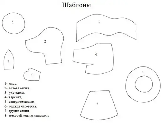 Материалы: заготовки из картона и цветной бумаги: основа свидетельства, детали оленя и одежды, заготовки из искусственного меха: грудка оленя и меховой контур капюшона, проволока, бисер, клей.
