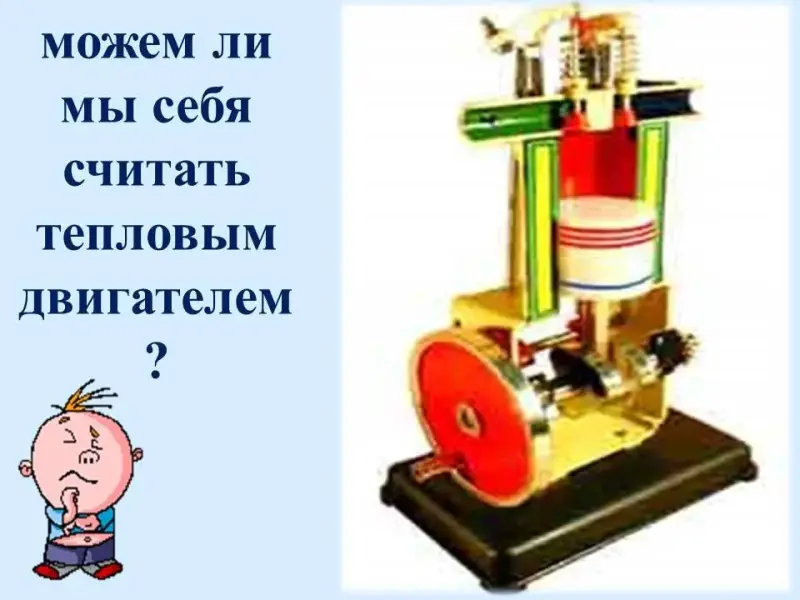 - Тогда такой вопрос: можем ли мы себя считать тепловым двигателем? - Какие основные элементы у нас для этого должны быть? |