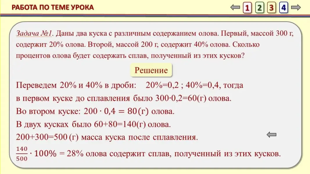 1. Переведем 20% и 40% в дроби. 20%=0,2 ; 40%=0,4, тогда в первом куске до сплавления было 3000,2=60(г) олова.