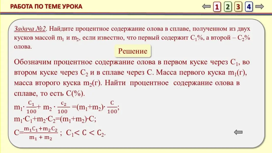 Найдите процентное содержание олова в сплаве, полученном из двух кусков массой m1 и m2, если известно, что первый содержит С1%, а второй - С2% олова.