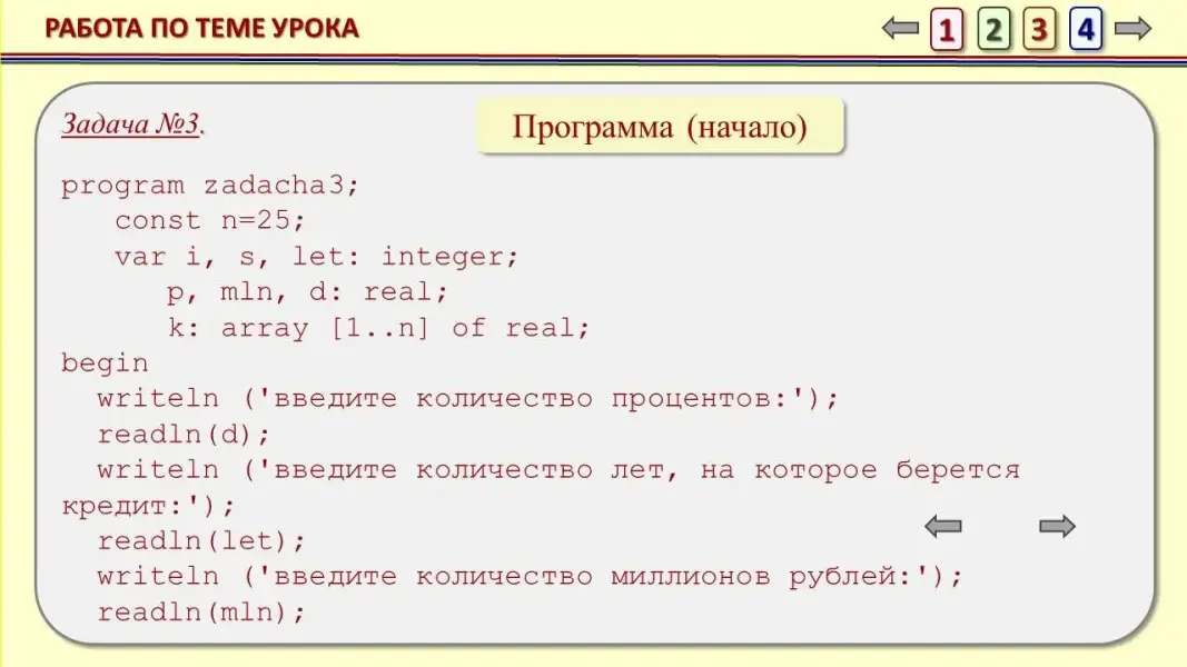 Учитель математики: Сегодня у нас не обычный урок. Рассмотрим текстовые задачи на проценты (экономические задачи), которые можно решать не только с конкретными числами, но и в общем виде. Это позволит решать целый класс однотипных задач, отличающихся лишь числовыми данными. А необычность урока заключается в том, что мы составим программы для решения любой задачи данного типа с помощью компьютера.