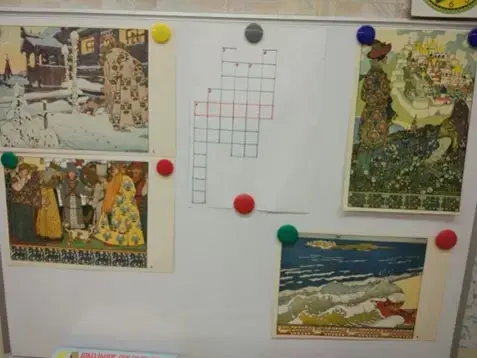 Материалы и оборудование: портрет А.С.Пушкина, выставка книг А.С.Пушкина, работы детей по сказкам А.С.Пушкина, волшебный сундучок с атрибутами, кроссворд, конверты с заданиями, панно дуб.