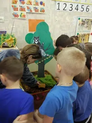 Воспитатель: Давайте скажем волшебные слова: «Катись клубок впереди, детей из сказки выводи». (Воспитатель катит клубок, дети проходят за столы).