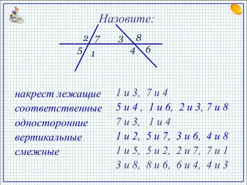Накрест лежащие, односторонние, соответственные углы, вертикальные, смежные.