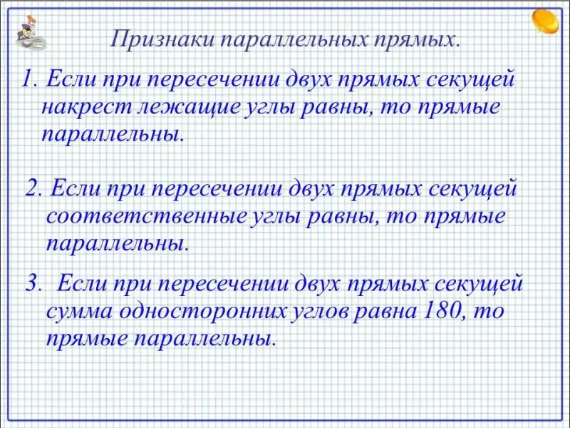 3. Если при пересечении двух прямых секущей сумма односторонних углов равна 180°, то прямые параллельны.