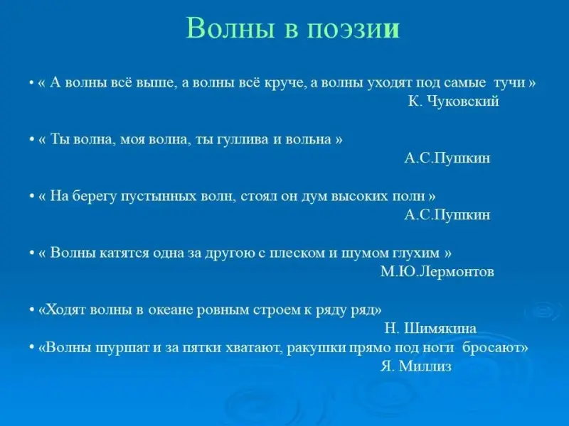 Учитель: Так как тема нашего урока сегодня - Волны, то давайте вспомним строки из поэтических произведений, где упоминались бы волны.