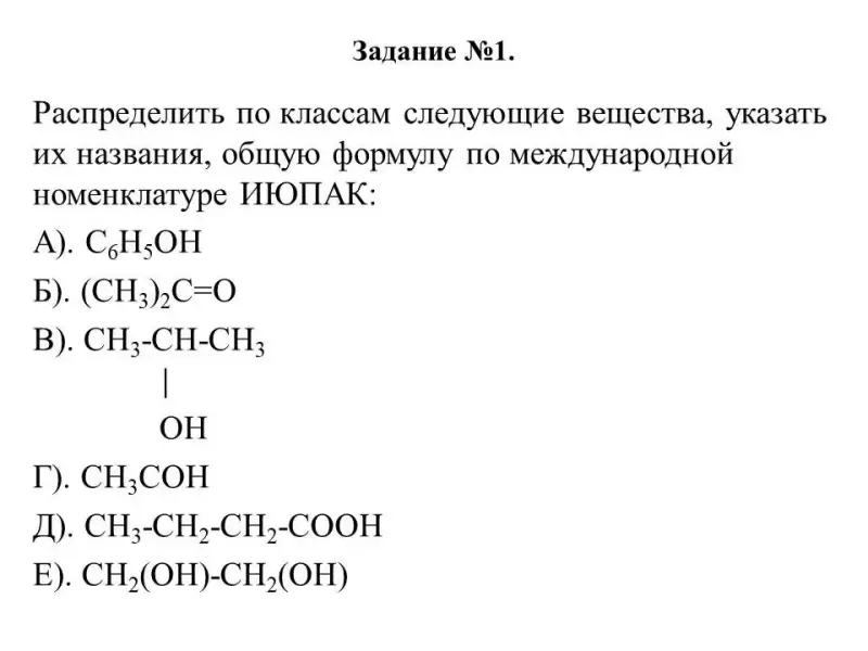 Задание №1. Распределить по классам следующие вещества, указать их названия, общую формулу по международной номенклатуре ИЮПАК (устно, фронтальный опрос):
