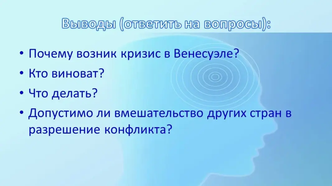 При закреплении темы нужно ответить на основные вопросы урока. Затем учащимися были сделаны общие выводы о том, как разрешить политический кризис в Венесуэле. Учитель ознакомила ребят с результатами их работы на уроке. Рефлексия помогает определить степень результативности урока. Было задано домашнее задание, для более детального закрепления новой темы необходимо закончить работу в контурной карте. На уроке используется фото Гуайдо и Мадуро, флаг Венесуэлы, политическая карта мира, атласы 10 класса, мультимедийный проектор, компьютерная техника, приложения с фотографиями и видеосюжеты из средств массовой информации.