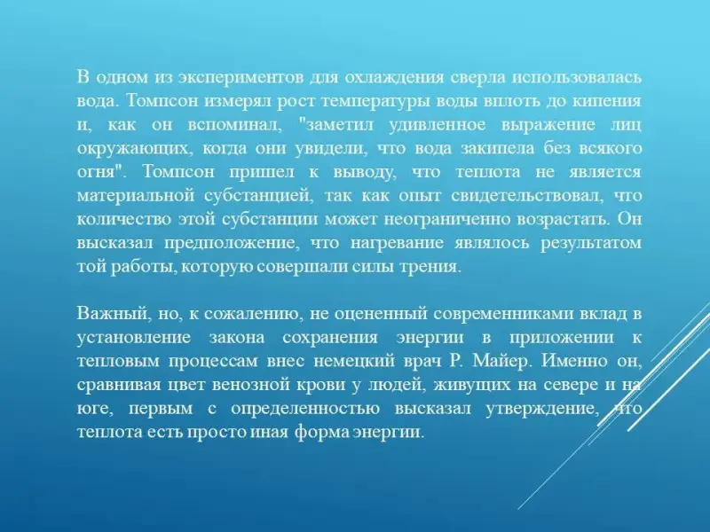 Среди тех, кто внес значительный вклад в развитие идей термодинамики, были Б.Томпсон (граф Румфорд), Р.Майер и Дж.Джоуль. Заслугой Томпсона является опровержение бытовавшей в XVIII в. теории "калорической жидкости", которая перетекает из одного тела в другое при нагревании или охлаждении. При этом (по аналогии с течением воды) полное количество калорической жидкости должно сохраняться. Наблюдая сильное нагревание, возникавшее в результате сверления стволов пушек на оружейном заводе, Томпсон заметил, что это невозможно объяснить перетеканием калорической жидкости от других тел, тем более что эффект накапливался, т.е. теплота каким-то образом генерировалась. Он попытался провести количественные эксперименты. В одном из экспериментов для охлаждения сверла использовалась вода. Томпсон измерял рост температуры воды вплоть до кипения и, как он вспоминал, "заметил удивленное выражение лиц окружающих, когда они увидели, что вода закипела без всякого огня". Томпсон пришел к выводу, что теплота не является материальной субстанцией, так как опыт свидетельствовал, что количество этой субстанции может неограниченно возрастать. Он высказал предположение, что нагревание являлось результатом той работы, которую совершали силы трения.