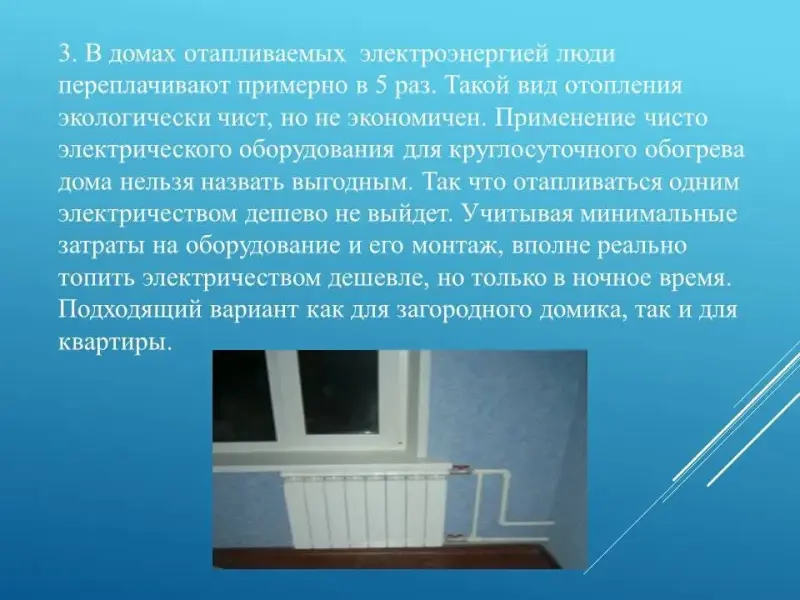 - В домах отапливаемых электроэнергией люди переплачивают примерно в 5 раз. Такой вид отопления экологически чист, но не экономичен. Применение чисто электрического оборудования для круглосуточного обогрева дома нельзя назвать выгодным. Так что отапливаться одним электричеством дешево не выйдет. Учитывая минимальные затраты на оборудование и его монтаж, вполне реально топить электричеством дешевле, но только в ночное время. Подходящий вариант как для загородного домика, так и для квартиры.