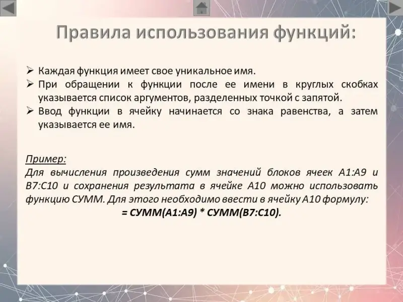 Для вычисления произведения сумм значений блоков ячеек А1:А9 и В7:С10 и сохранения результата в ячейке А10 можно использовать функцию СУММ.