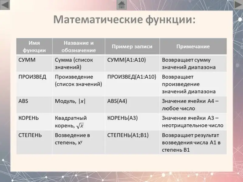 (Слайд 5) Математические функции. Из математических функций наиболее часто используются следующие: