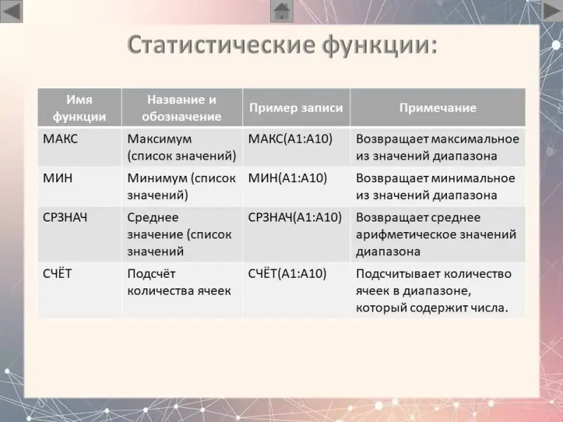 (Слайд 6) Статистические функции. Из математических функций наиболее часто используются следующие: