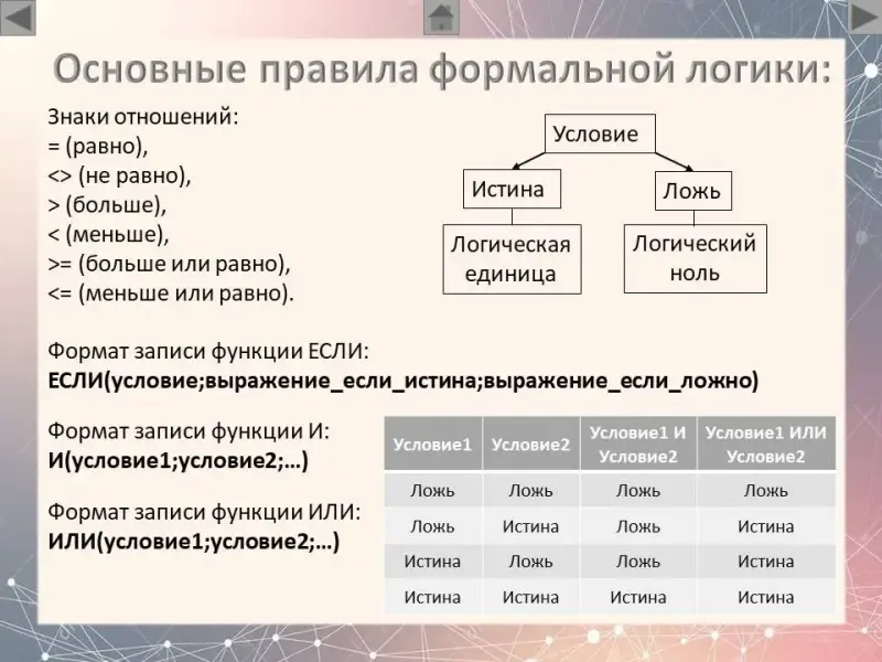 Для вычисления результата сложного условия необходимо знать, как определяется результат соответствующей логической операции (И, ИЛИ и др.). Ответ на этот вопрос дает таблица истинности. (ПКМ)