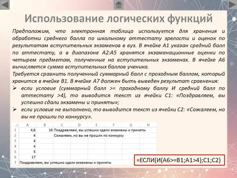 - если условие (суммарный балл >= проходному баллу И средний балл по аттестату >4), то выводится текст из ячейки С1: «Поздравляем, вы успешно сдали экзамены и приняты»;