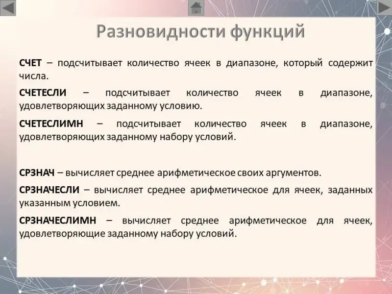 (Слайд 10) Некоторые функции в табличном процессоре имеют разновидности. Рассмотрим их. Очень часто в задачах на обработку большого массива данных нужно определить количество записей. Например, количество учеников, количество городов, количество продуктов и т.д. Для ответа на этот вопрос можно воспользоваться функцией СЧЕТ (ПКМ). Но общее количество записей можно легко узнать и без этой функции. Обычно в задачах нужно определить не общее количество записей, а количество записей, удовлетворяющих условию. Для этого можно воспользоваться функцией СЧЕТЕСЛИ (ПКМ). Если же условий два и более, то нам поможет функция СЧЕТЕСЛИМН (ПКМ). Такие же разновидности имеют и другие функции (ПКМ): СРЗНАЧ, СУММ.
