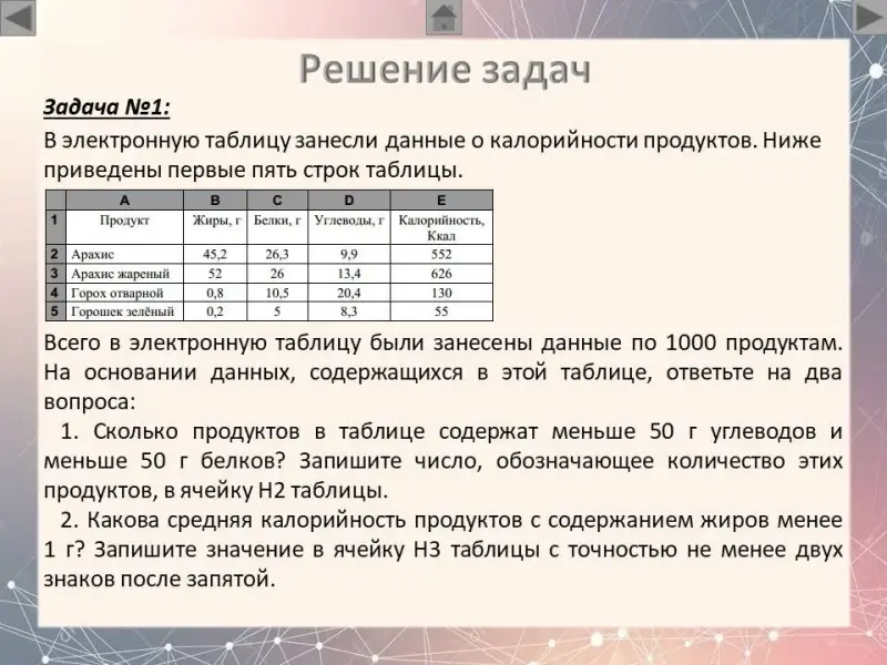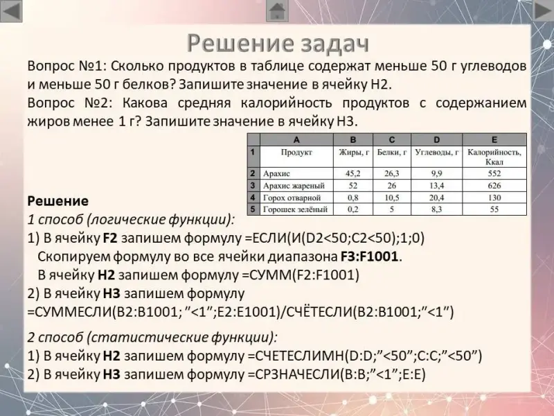 1. Сколько продуктов в таблице содержат меньше 50 г углеводов и меньше 50 г белков? Запишите число, обозначающее количество этих продуктов, в ячейку H2 таблицы.