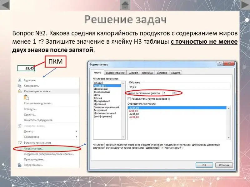 (Слайд 13) Обратите внимание на вторую половину вопроса №2: «Запишите значение в ячейку H3 таблицы с точностью не менее двух знаков после запятой». Чтобы изменить количество знаков после запятой нужно выполнить следующую последовательность действий: