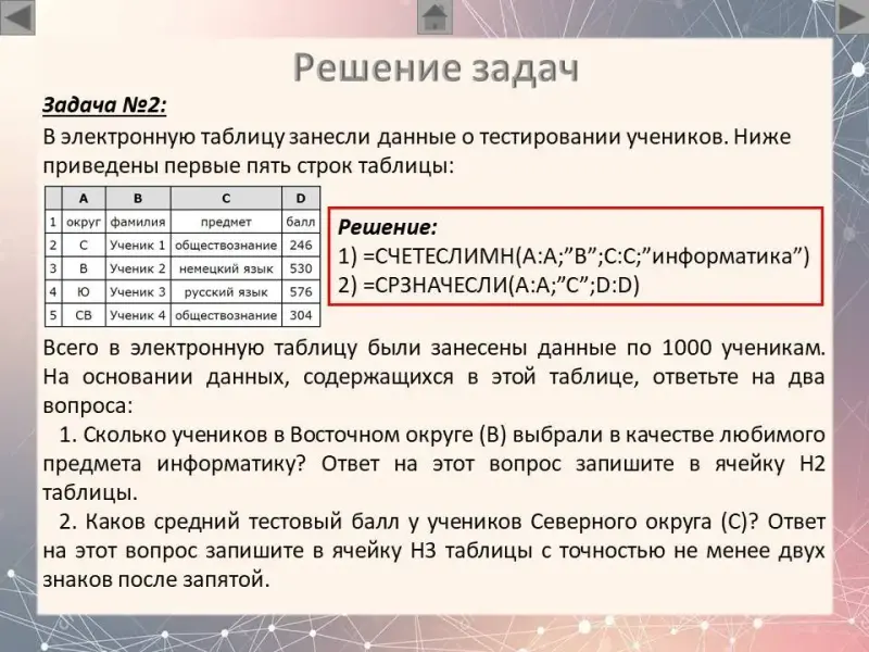 (Слайд 14) Для закрепления материала рассмотрим следующую задачу. В электронную таблицу занесли данные о тестировании учеников. На слайде приведены первые пять строк таблицы. В столбце А записан округ, в котором учится ученик; в столбце В - фамилия; в столбце С - любимый предмет; в столбце D - тестовый балл. Всего в электронную таблицу были занесены данные по 1000 ученикам. На основании данных, содержащихся в этой таблице, ответьте на два вопроса.