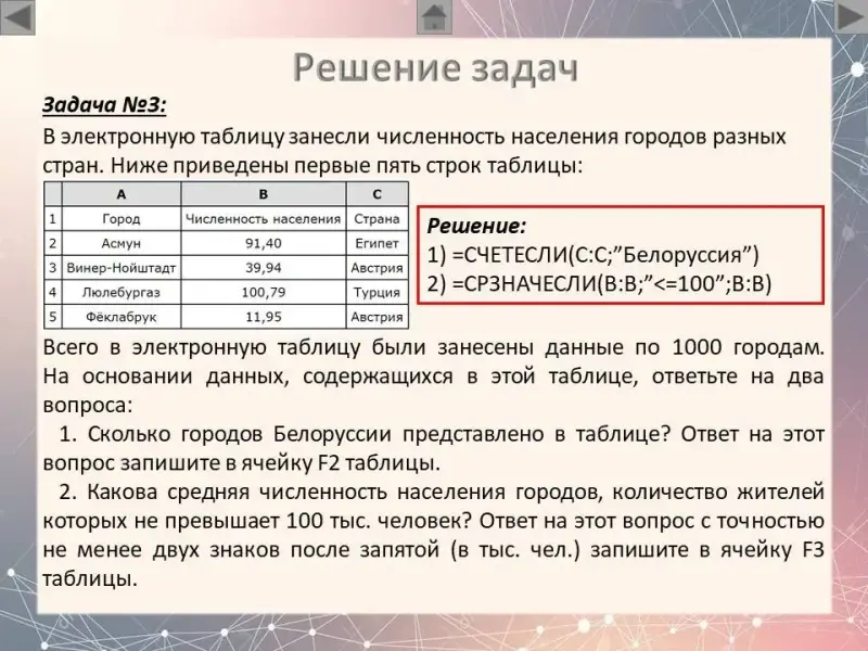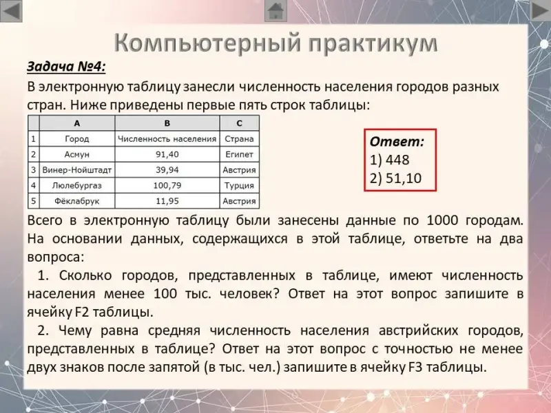 2. Какова средняя численность населения городов, количество жителей которых не превышает 100 тыс. человек? Ответ на этот вопрос с точностью не менее двух знаков после запятой (в тыс. чел.) запишите в ячейку F3 таблицы.