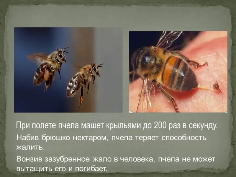 Вонзив зазубренное жало в человека, пчела не может вытащить его и погибает.