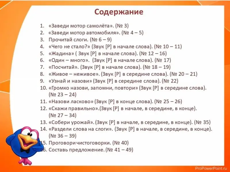 Игровые упражнения направлены на закрепление правильного произношения звука [Р] в слогах (прямых и обратных), в словах, во фразах. Так, например, игровые упражнения «Заведи мотор самолёта», «Заведи мотор автомобиля» (слайды № 3, 4) помогут закрепить у ребёнка правильное произношение изолированного звука [Р], а игры «Чего не стало?» (№ 10 - 11), «Жадина» (№ 12 - 16), «Один - много» (№ 17), «Посчитай» (№ 18 - 19) развивают навык произношения звука [Р] в начале слов. Автоматизировать произношение [Р] в середине слова можно, используя упражнения «Живое - неживое» (№ 20 - 21), «Узнай и назови» (№ 22), «Громко назови, запомни, повтори» (№ 23 - 24), «Назови ласково» (№ 25 - 26), «Скажи правильно» (№ 27 - 34), «Собери урожай» (№ 35), «Раздели слова на слоги» (№ 36 - 39). Задания «Проговори чистоговорки» (№ 40), «Составь предложение» (№ 41 - 49) закрепляют правильное произношение звука [Р] во фразах.