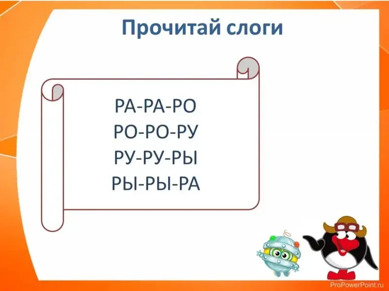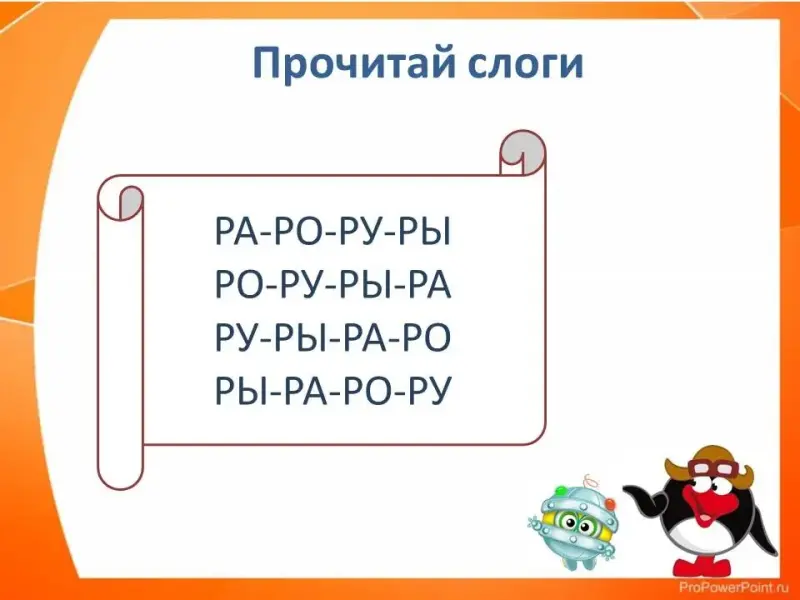 Логопед: - Пин учит Биби читать. Биби трудно произносить эти слоги. Давай поможем ему, будем произносить слоги (читать), выделяя звук [Р].