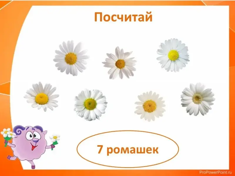 Описание: На слайдах изображения Смешариков и предметов (ромашек, рыб).