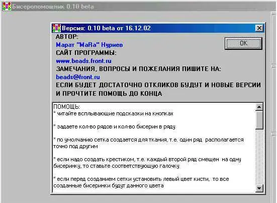 Познакомимся с работой приложения. При запуске графического редактора Biserhelp открывается диалоговое окно, где представлена контактная информация и помощь - краткое руководство по работе с программой (рис.1). Программа русифицирована, что существенно облегчает работу с ней.