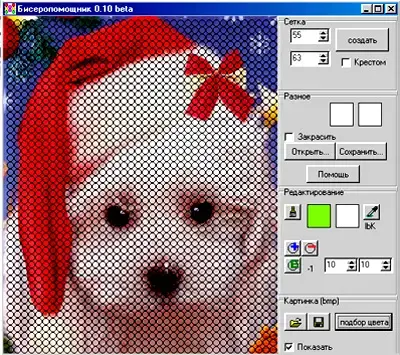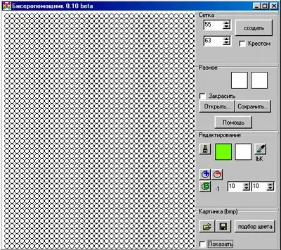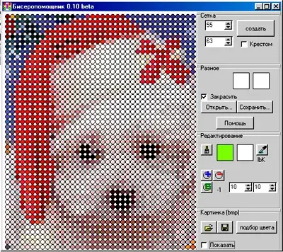 В графическом редакторе Biserhelp существует возможность задавать и изменять цвет канвы, бисерин и фона. Если перед созданием сетки установить левый цвет кисти, то все бисерины будут окрашены в этот цвет. Для отображения цвета бисера необходимо установить флажок "закрасить". Бисерины можно также окрашивать по отдельности с помощью левой и правой кисти. В соответствующих полях выводятся номер текущей бисерины и её координаты, которые можно изменять. При редактировании схемы существует возможность добавлять, удалять и перемещать бисерины, а также редактировать их свойства. Сохранение результатов на любом этапе работы над схемой в формате *.btf, позволяет в дальнейшем редактировать схему [2].