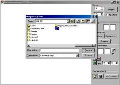 Для создания схемы из готового изображения сначала следует создать сетку нужного размера, для этого в соответствующих полях необходимо задать количество рядов и бисерин в ряду (например, 55х63) (рис. 3), а также выбрать способ их расположения. Затем загрузить нужное изображение, для этого на панели инструментов нажать кнопку Открыть bmp, при этом вызывается диалоговое окно Открытие файла(рис. 4).