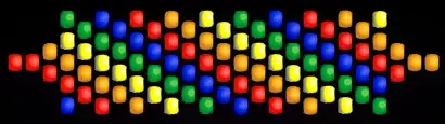 Рабочее поле Beadwork представляет собой сетку-матрицу, узлы которой (местоположение бисерин) обозначены точками и размещены в шахматном порядке. Размер матрицы - 5х10 узлов. Ниже располагается палитра в виде бисерин 7 цветов в следующей последовательности: серый, красный, оранжевый, желтый, зеленый, синий, белый.