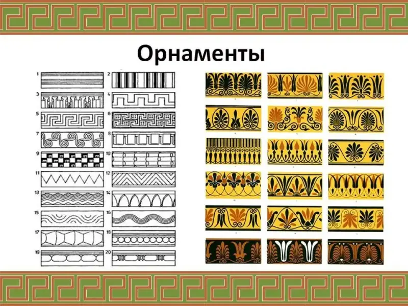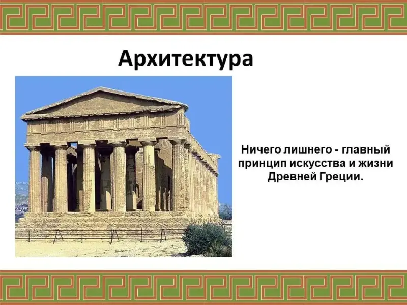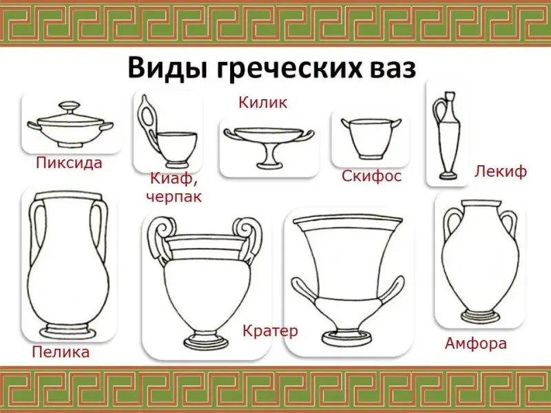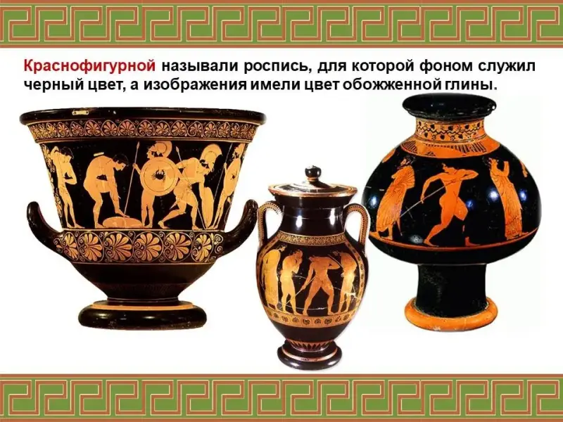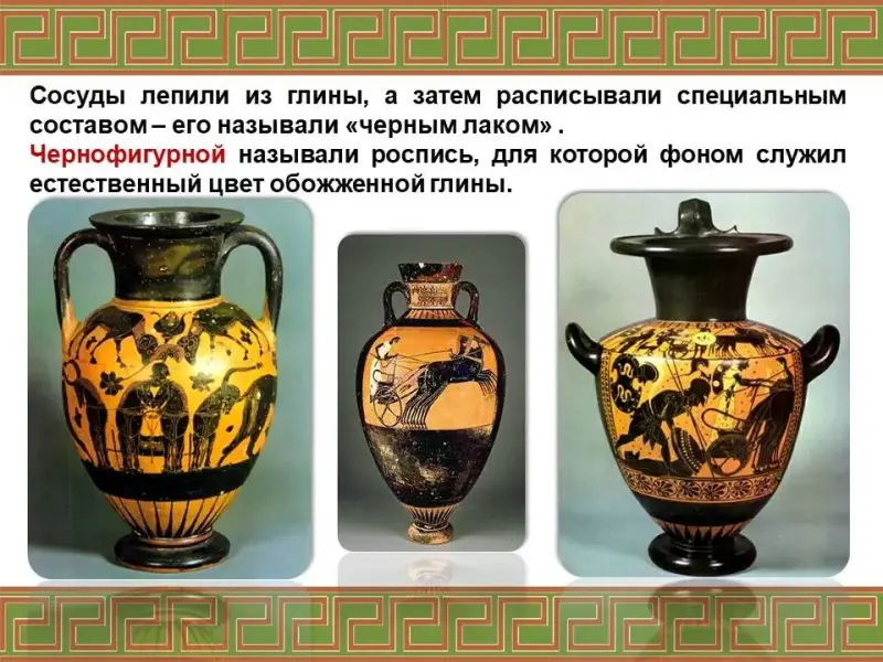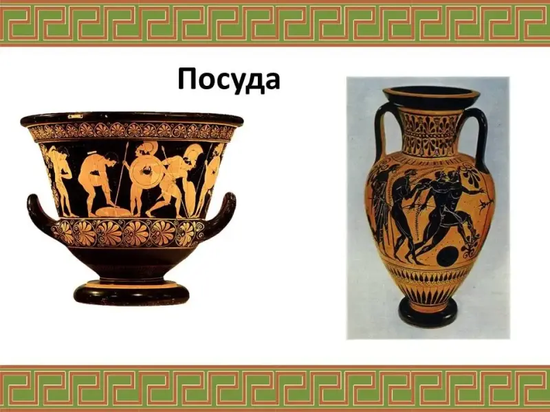 Ремесло, одежда (хитон, гиматий), архитектура (колонны), скульптура, вазопись (чернофигурная и краснофигурная), орнамент |