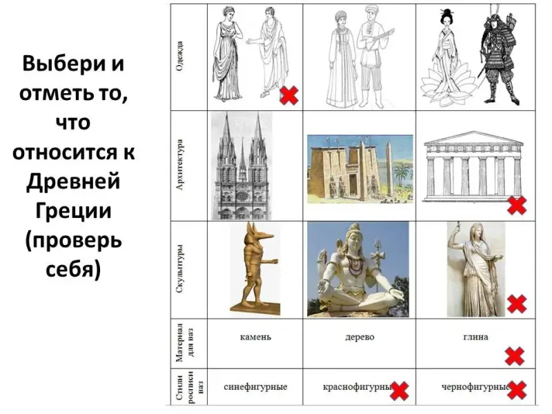 Рабочая тетрадь, компьютер, проектор, экран, презентация «Быт и занятия древних греков», раздаточный материал, тесты для проверки усвоения материала занятия, ножницы, цветные карандаши, клей, |