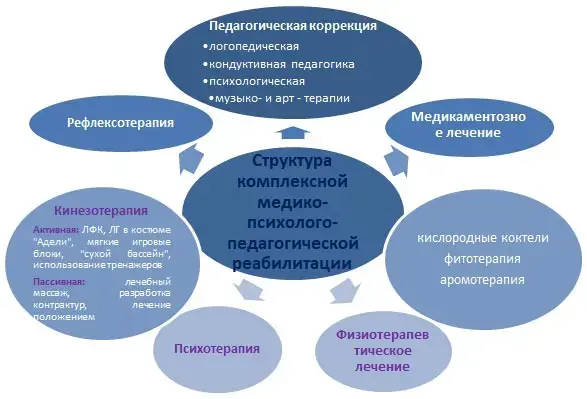 В основе реабилитации лежит своевременная и адекватная диагностика имеющихся нарушений, осуществляемая в режиме сравнительного сопоставления с нормативами нервно-психического развития здоровых детей. Такой подход позволяет определить «зону ближайшего развития», направления коррекционно-логопедической, психологической и педагогической работы (создание индивидуальной коррекционно-развивающей программы с соблюдением принципа единства диагностики и коррекции, с учетом структуры дефекта, картиной дизонтогенеза, возрастом ребенка, характерологических черт ребенка, особенностей вторичных отклонений в развитии, соматического и психического состояния, рекомендациями врачей и узких специалистов).
