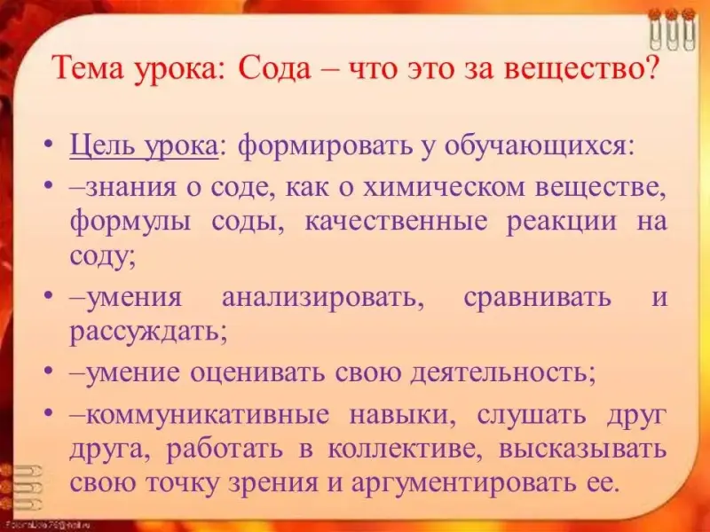 - знания о соде, как о химическом веществе, формулы соды, качественные реакции на соду;