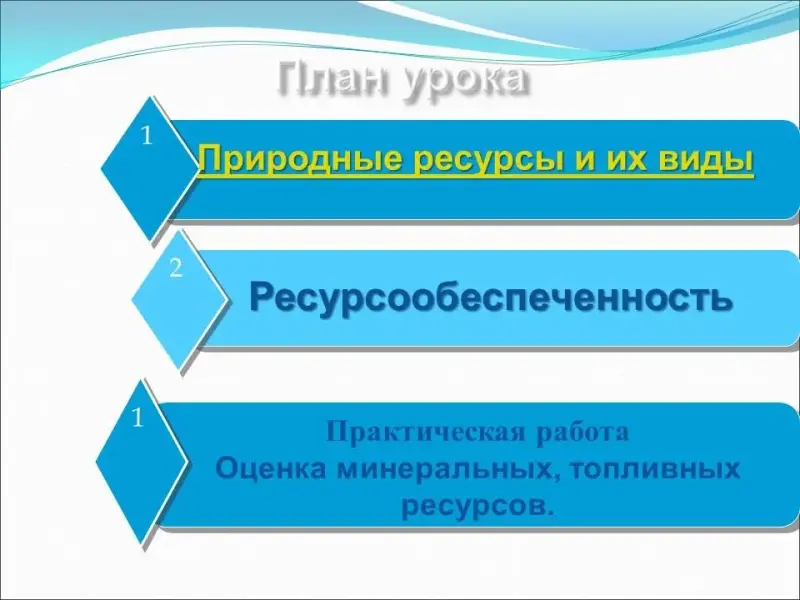 - Уметь объяснять понятия «Природные ресурсы» и «Ресурсообеспеченность»