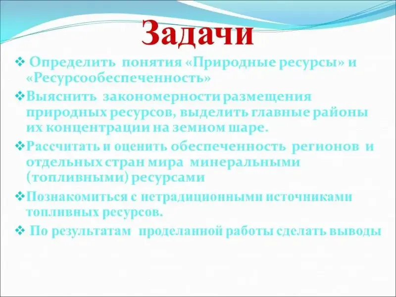 - Выяснить закономерности размещения природных ресурсов, выделить главные районы их концентрации на земном шаре.