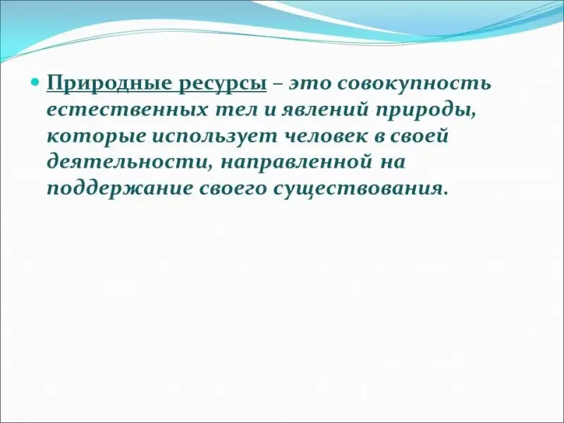 Природные ресурсы - это совокупность естественных тел и явлений природы, которые использует человек в своей деятельности, направленной на поддержание своего существования.