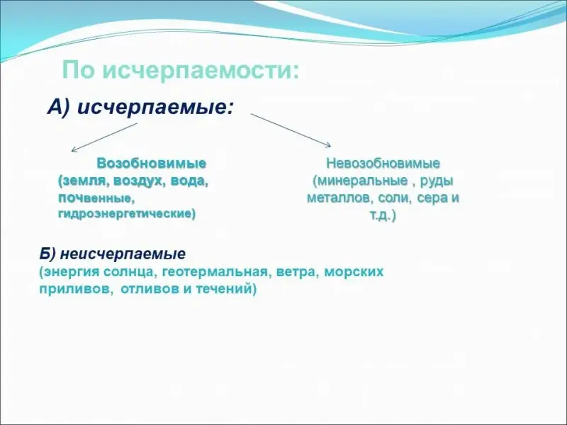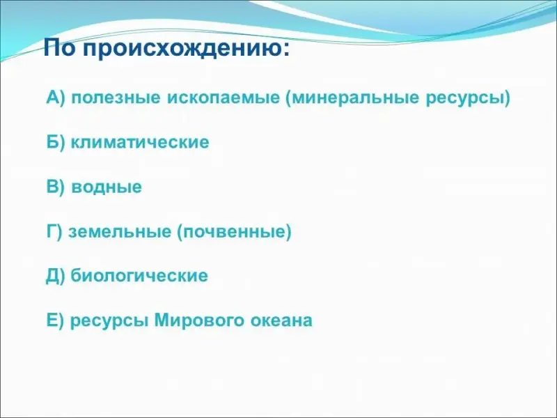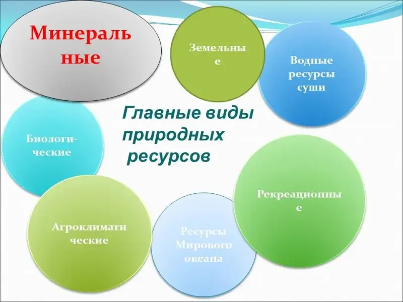 Главные виды природных ресурсов: минеральные, земельные, водные, биологические, рекреационные, ресурсы мирового океана, агроклиматические.