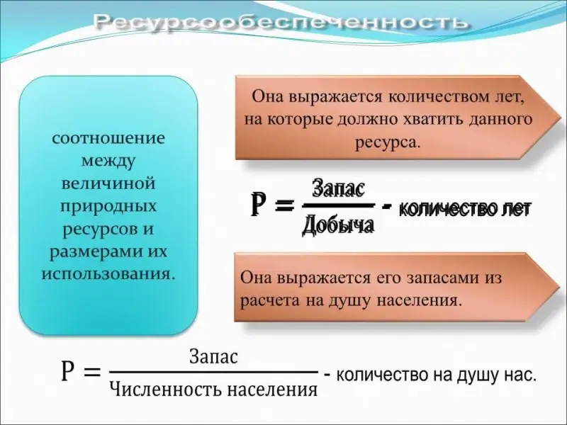 Ресурсообеспеченность- это соотношение между величиной природных ресурсов и размерами их использования. Она выражается количеством лет, на которые должно хватить данного ресурса, либо его запасами из расчета на душу населения.