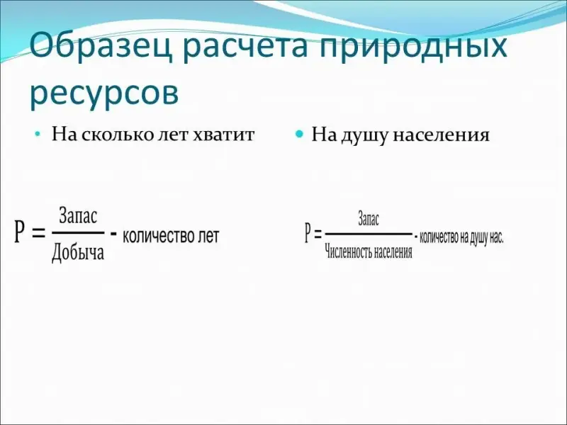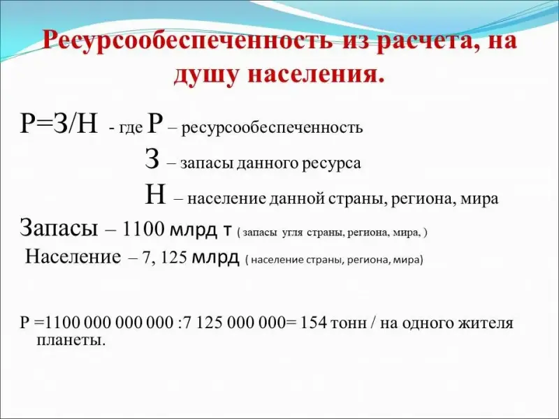 Р=З/Н - где Р - ресурсообеспеченность З - запасы данного ресурса Н - население данной страны, региона, мира.