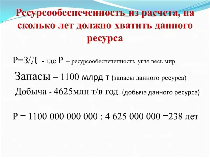 Р=З/Д - где Р - ресурсообеспеченность угля весь мир, З - запасы, Д - добыча