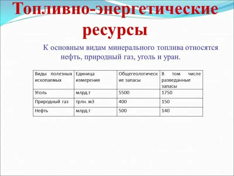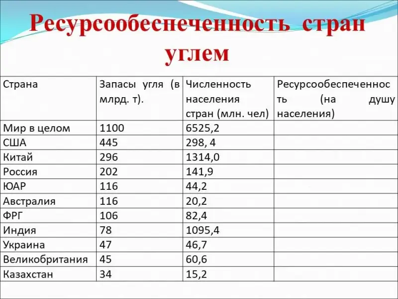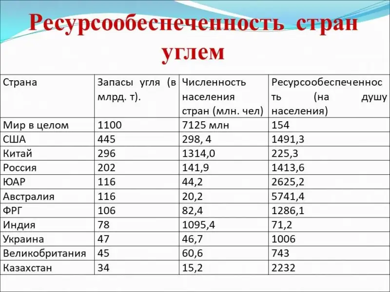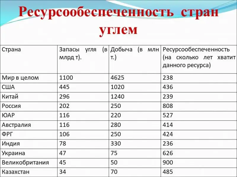 Запасы угля - 1100 млрд т (запасы данного ресурса)
