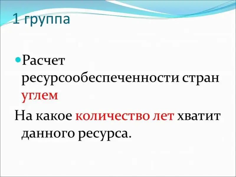- 1 группа : Расчет ресурсообеспеченности стран углем, на какое количество лет хватит данного ресурса в отдельных странах.