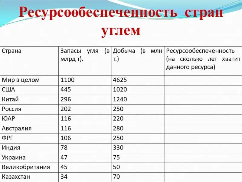 1 группа: Расчет ресурсообеспеченности стран углем, на какое количество лет хватит данного ресурса в отдельных странах.