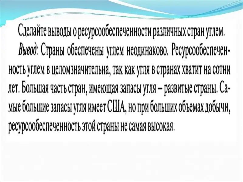 Сделайте выводы о ресурсообеспеченности различных стран углем по плану.