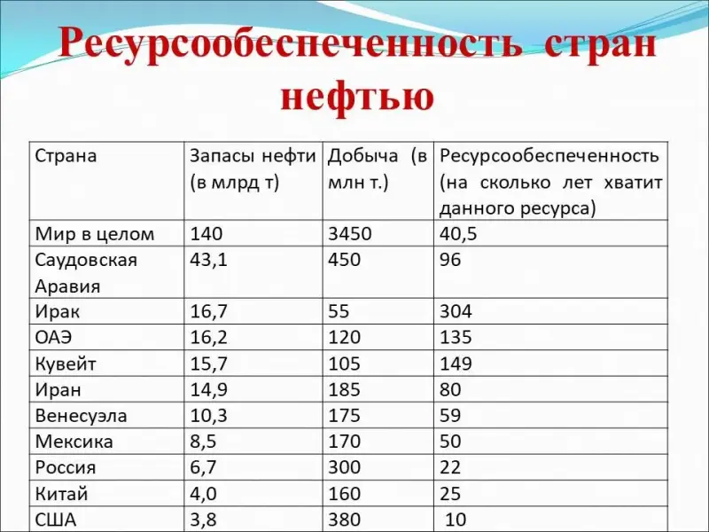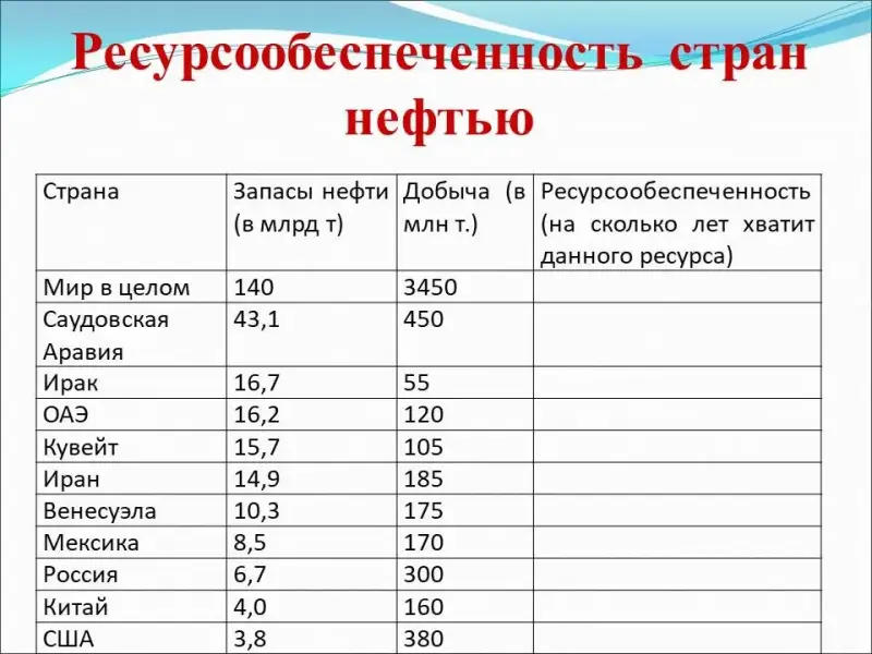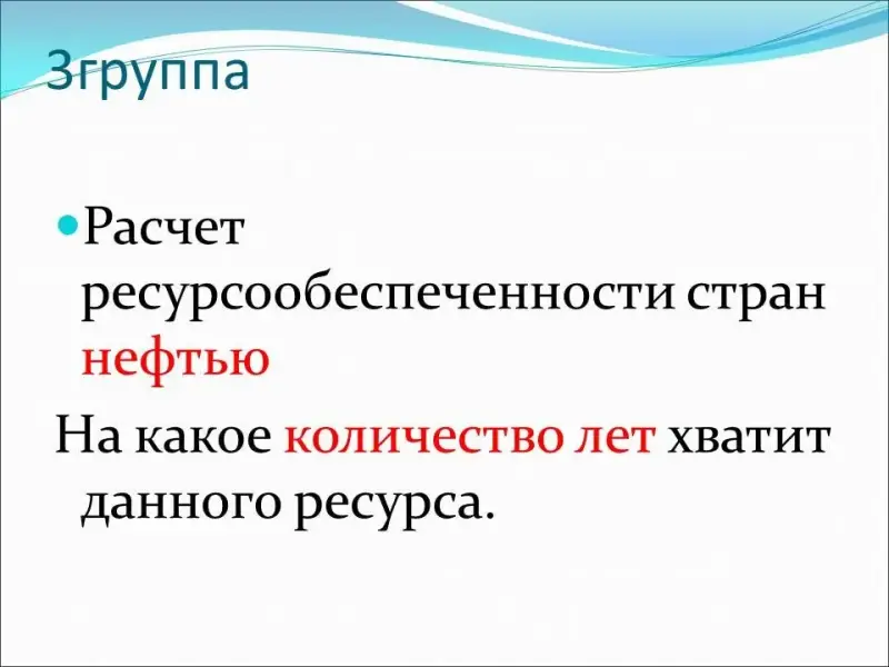 - 3 группа: Расчет ресурсообеспеченности стран нефтью, на какое количество лет хватит данного ресурса в отдельных странах.