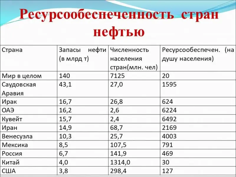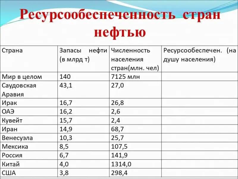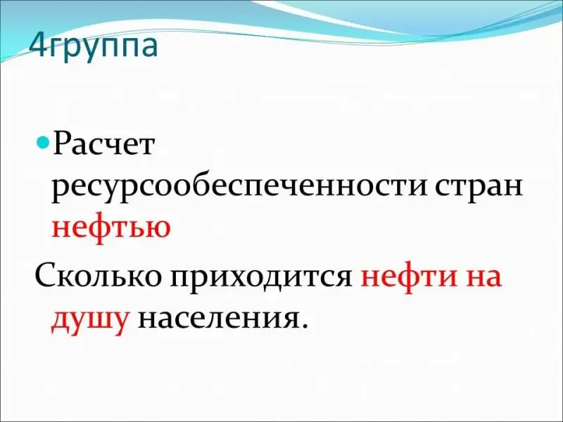- 4 группа: Расчет ресурсообеспеченности стран нефтью, из расчета нефти на душу населения в отдельных странах.