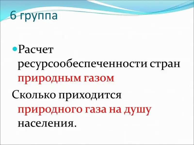 - 6 группа: Расчет ресурсообеспеченности стран природным газом, из расчета природного газа на душу населения.